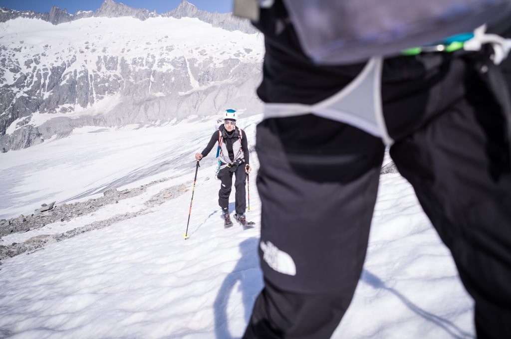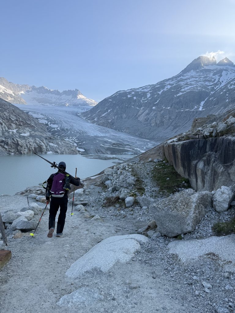Heute ist von dem Gletscher weit und breit nichts zu sehen. Nach einem ca. 30 minütigen Fußabstieg (vorbei an der skurrilen, mit Planen abgedeckten Touristenattraktion Eisgrotte) erreichst du einen Gletschersee und den Talboden. Bei guter Schneelage beginnt die eigentliche Skitour hier. Dich erwartet ein langer und anstrengender Aufstieg. Mit einer guten Kondition kannst du die ersten flachen Kilometer rasch hinter dich bringen, danach steilen sich die Hänge wellenförmig auf. Die Spur will in dem 30-35 Grad steilen Gelände gut gelegt sein und du musst dich bald entscheiden: Gehst du mit oder ohne Harscheisen oder legst du gleich die Steigeisen an. Für letztere Variante haben wir uns im Gipfelbereich entschieden. Die Westflanke liegt lange im Schatten und der Schnee bleibt bis in den späten Vormittag gefroren. Hier kommst du mit Steigeisen meist besser und sicherer voran. Das Gipfelpanorama dominieren die nahen Berner Viertausender mit dem Finsteraarhorn, in zweiter Reihe erkennst du die Walliser Gipfel mit Monte Rosa und Matterhorn und ganz weit weg, quasi gegenüber identifizierst du die Berninagruppe am Horizont.