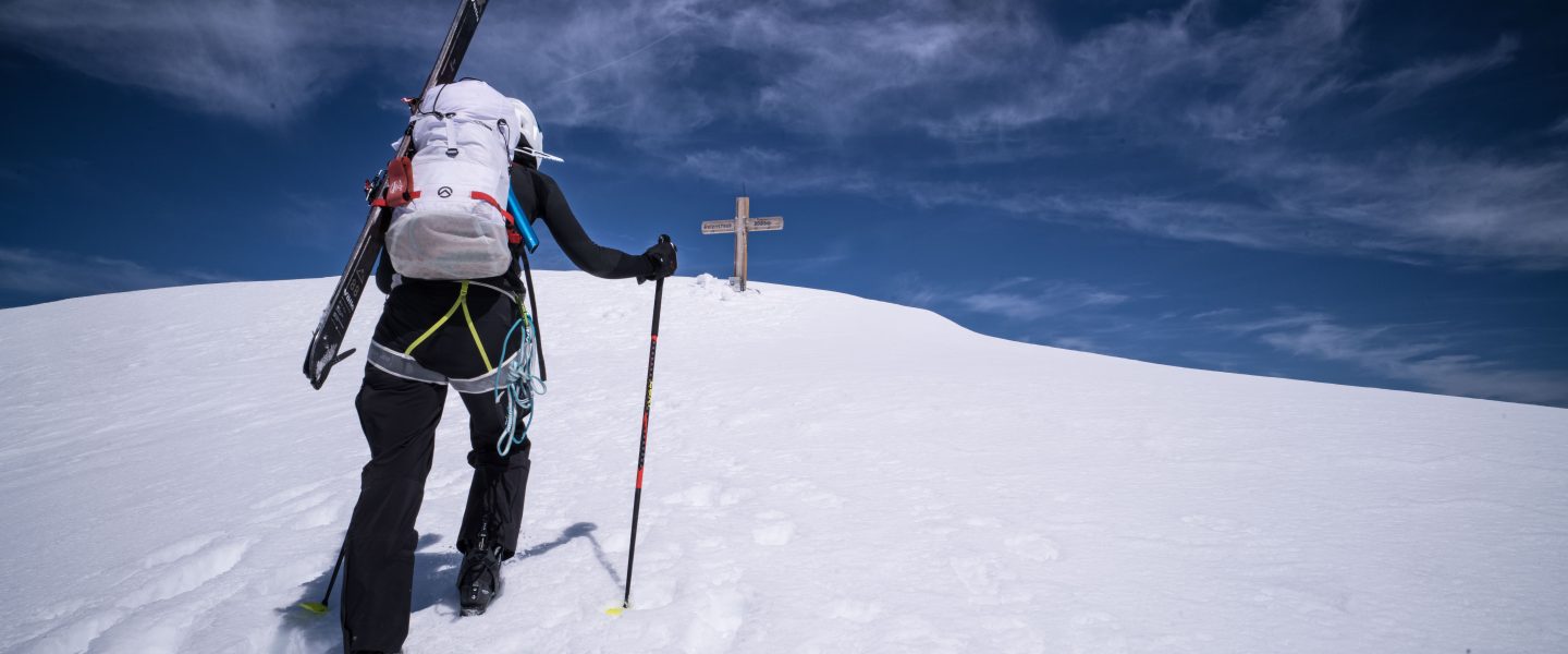 Die Ski kannst du direkt neben dem Gipfelkreuz anschnallen und wenn dein Timing stimmt, dann erwartet dich eine Firnabfahrt vom Feinsten. Die Sonnenstrahlen werden die Südwesthänge nicht zu früh erfassen, also lass dir Zeit und starte nicht zu früh – dann aber gibt es kein halten: über 1.000 Höhenmeter in bestem teilweise steilem Skigelände liegen vor dir. Und auch danach ist ist der Spaß noch lange nicht vorbei, wenn du die letzten 400 Höhenmeter über den flach auslaufenden Rhonegletscher carvst.