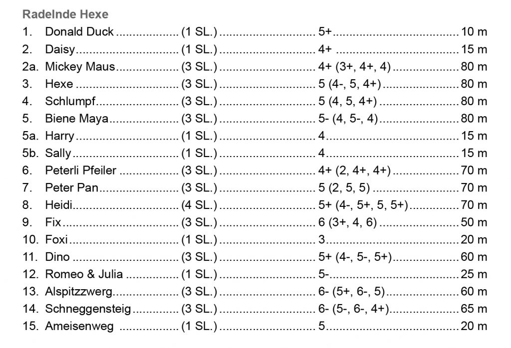 Der Klettergarten „Radelnde Hexe“ wurde vor rund 30 Jahren vom staatlich geprüften Berg- und Skiführer Udo Knittel eingerichtet und erfreut sich seither großer Beliebtheit, sowohl bei Hobbykletterern aus der Region als auch bei Gästen von weiter her. Ein besonderes Highlight ist der speziell eingerichtete Kindersektor, der das Gebiet auch zu einem beliebten Ausbildungsgelände macht.